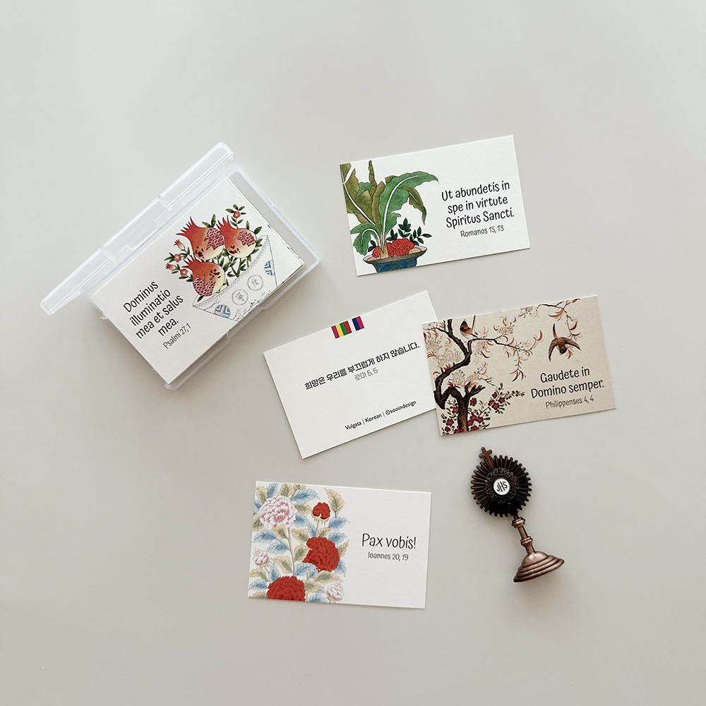 2027년 WYD를 겨냥해서 만든 라틴어 말씀카드입니다.우리나라의 전통민화를 넣어 제작했어요.민화는 김진 작가님의 작품입니다.총 24장으로 한잔 한장 민화 작품같은 말씀카드로소장하기도 좋도 외국인 친구에게 선물하기에너무 좋은 말씀카드입니다.(수입지, 사이즈 85X55mm)