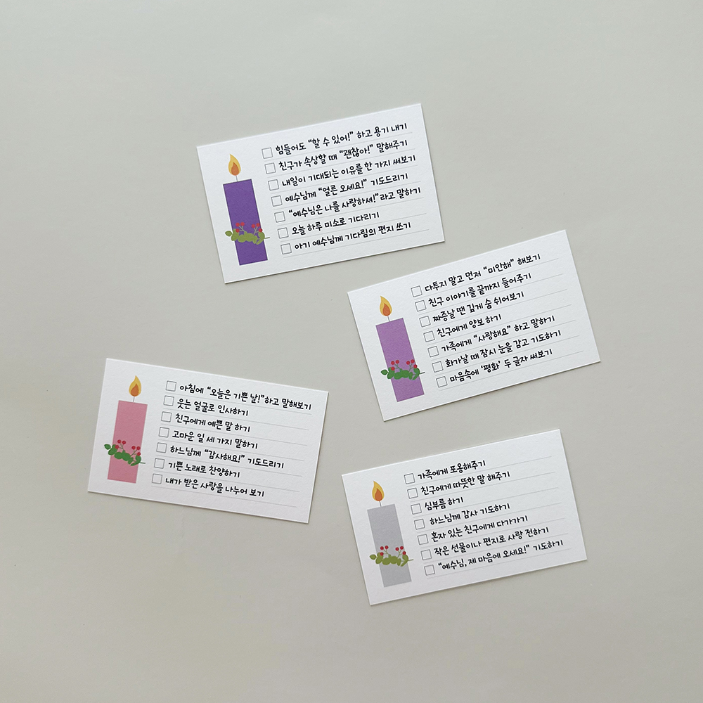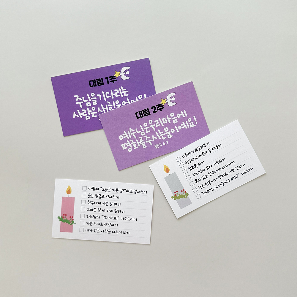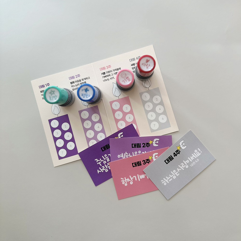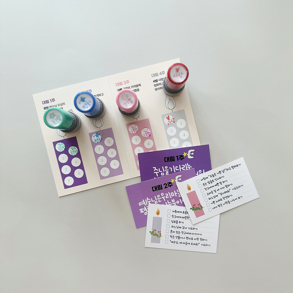 대림시기에 필요한 대림실천표를 만들었어요.우리곁으로 오실 예수님을 기다리며한 주에 하나씩 주님의 말씀처럼 실천하는대림카드 4장이 함께 들어있어요.대림시기에 맞는 희망, 편화, 기쁨, 사랑4가지 스탬프와 함께하면 더 즐겁게 대림실천을 할 수 있어요.한 주 하나씩 실천하고 콩콩찍는 스탬프까지!원하시는 수량이 맞지 않는 경우는 따로 연락부탁드립니다.대림실천표 사이즈 90X125mm, 수입지 대림카드 85X55mm, 수입지